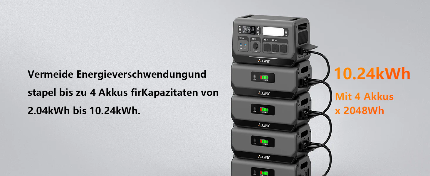 Die ALLWEI B200-2 PRO Erweiterungsbatterie ist die ideale Lösung, um deine Powerstation auf das nächste Level zu bringen. Mit einer beeindruckenden Kapazität von 2048 Wh erweitert sie die Leistung deiner PPS2400 Pro Powerstation zuverlässig und flexibel – perfekt für Zuhause, Camping, Wohnmobil oder als Notstromlösung.