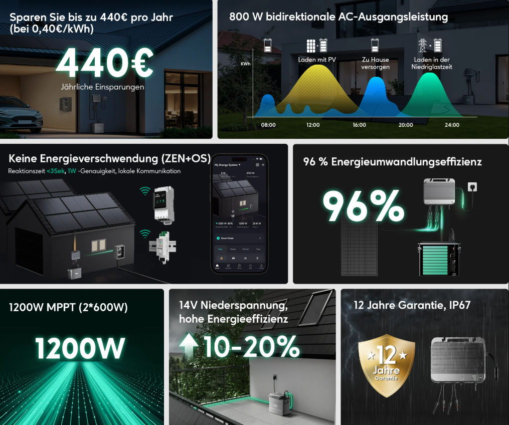 Die Zendure SolarFlow 800 ist das Perfekte Upgrade um den gestiegenen Bedarf an PV-Systemen mit größerer Kapazität gerecht zu werden und um höhere Energieerzeugungseffizienz und wirtschaftliche Vorteile zu erzielen. Der SolarFlow 800 ist darauf ausgelegt, den Benutzern eine flexiblere und nachhaltigere PV-Option zu bieten, um den wachsenden Energiebedarf zu decken.