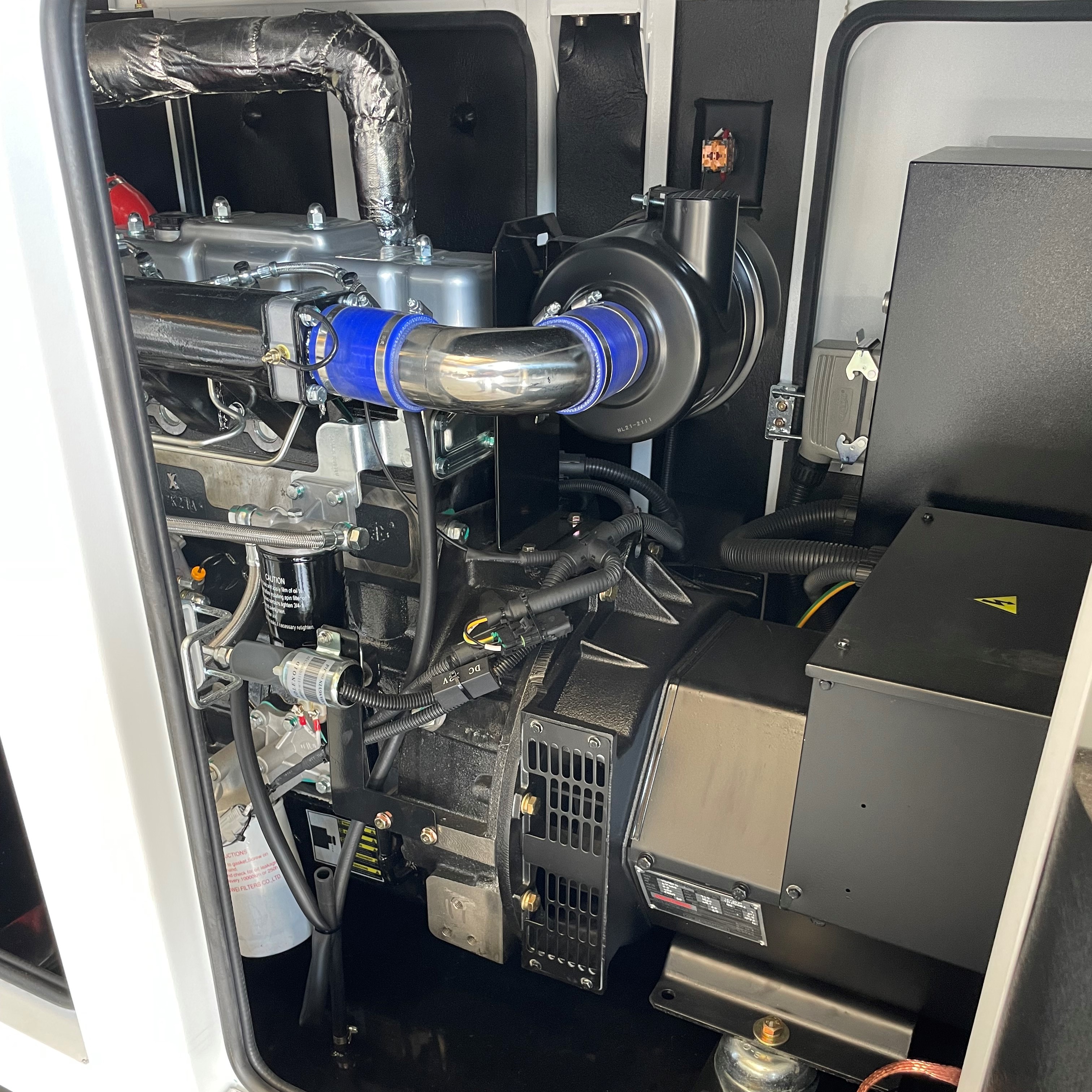 Das Gerät kommt voll ausgestattet mit Steckdosen (1x 230V, 63A; 1x 230V, 16A) und kann vom Elektriker auch über eine Klemmleiste angeschlossen werden.