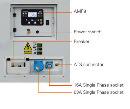 Die integrierte Multifunktionsanzeige (MRS10) beinhaltet eine Spannungs- und Stromanzeige, sowie eine Schutzanzeige des Generators, einen Stundenzähler, eine Batterieladeanzeige und eine Anzeige der Arbeitsstunden des Motors. Wird zusätzlich eine ATS-Box an die dafür vorgesehene Vorrichtung angeschlossen, ist ein automatischer Start des Industriestromaggregats möglich, sobald die Hauptstromversorgung unterbrochen wird.
