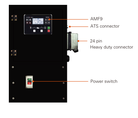 Die integrierte Multifunktionsanzeige (AMF9) beinhaltet eine Spannungs- und Stromanzeige, sowie eine Schutzanzeige des Generators, einen Stundenzähler, eine Batterieladeanzeige und eine Anzeige der Arbeitsstunden des Motors. Wird zusätzlich eine ATS Box an die dafür vorgesehene Vorrichtung angeschlossen, ist ein automatischer Start des Industriestromaggregats möglich, sobald die Hauptstromversorgung unterbrochen wird.
