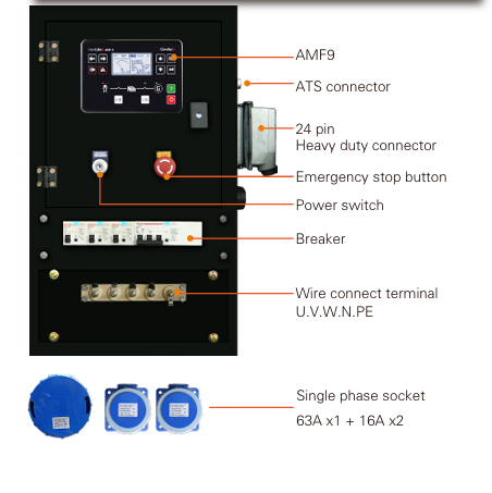 Die integrierte Multifunktionsanzeige (AMF9) beinhaltet eine Spannungs- und Stromanzeige, sowie eine Schutzanzeige des Generators, einen Stundenzähler, eine Batterieladeanzeige und eine Anzeige der Arbeitsstunden des Motors. Wird zusätzlich eine ATS Box an die dafür vorgesehene Vorrichtung angeschlossen, ist ein automatischer Start des Industriestromaggregats möglich, sobald die Hauptstromversorgung unterbrochen wird.