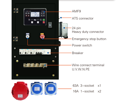 Die integrierte Multifunktionsanzeige (AMF9) beinhaltet eine Spannungs- und Stromanzeige, sowie eine Schutzanzeige des Generators, einen Stundenzähler, eine Batterieladeanzeige und eine Anzeige der Arbeitsstunden des Motors. Wird zusätzlich eine ATS Box an die dafür vorgesehene Vorrichtung angeschlossen, ist ein automatischer Start des Industriestromaggregats möglich, sobald die Hauptstromversorgung unterbrochen wird.