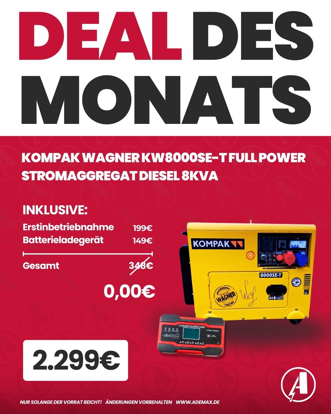 Das KOMPAK KW8000SE-T ist das erste Aggregat von Ademax, bei dem unser Dipl. Ing. Herr Wagner sein Know-How ins Spiel gebracht hat. Durch viele kleine Veränderungen hat er den Stromerzeuger noch langlebiger und qualitativ hochwertig gestaltet.