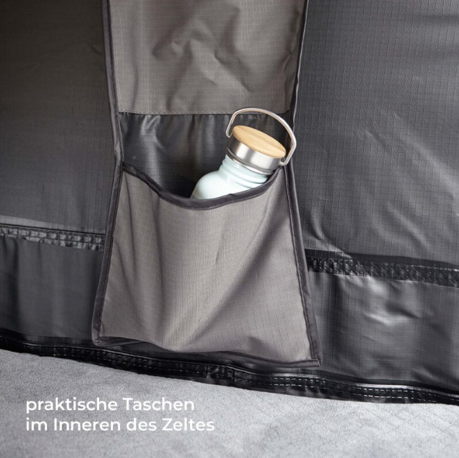 - 2 große Schuhaufbewahrungen an beiden Seiten des Zelteingangs