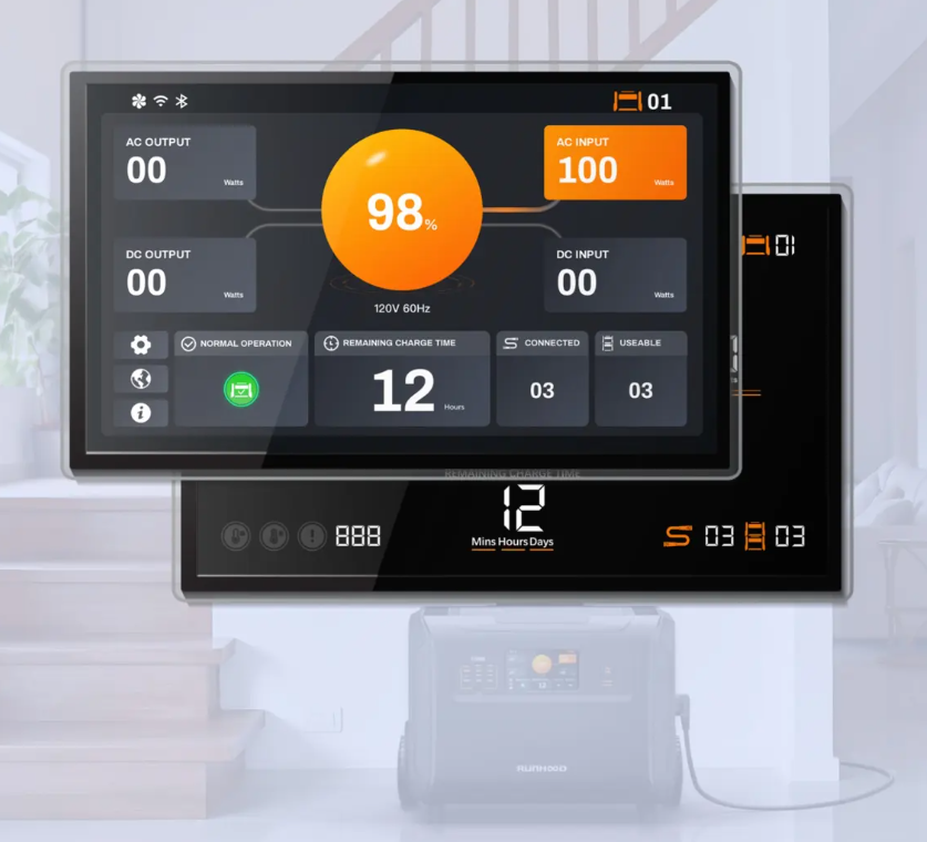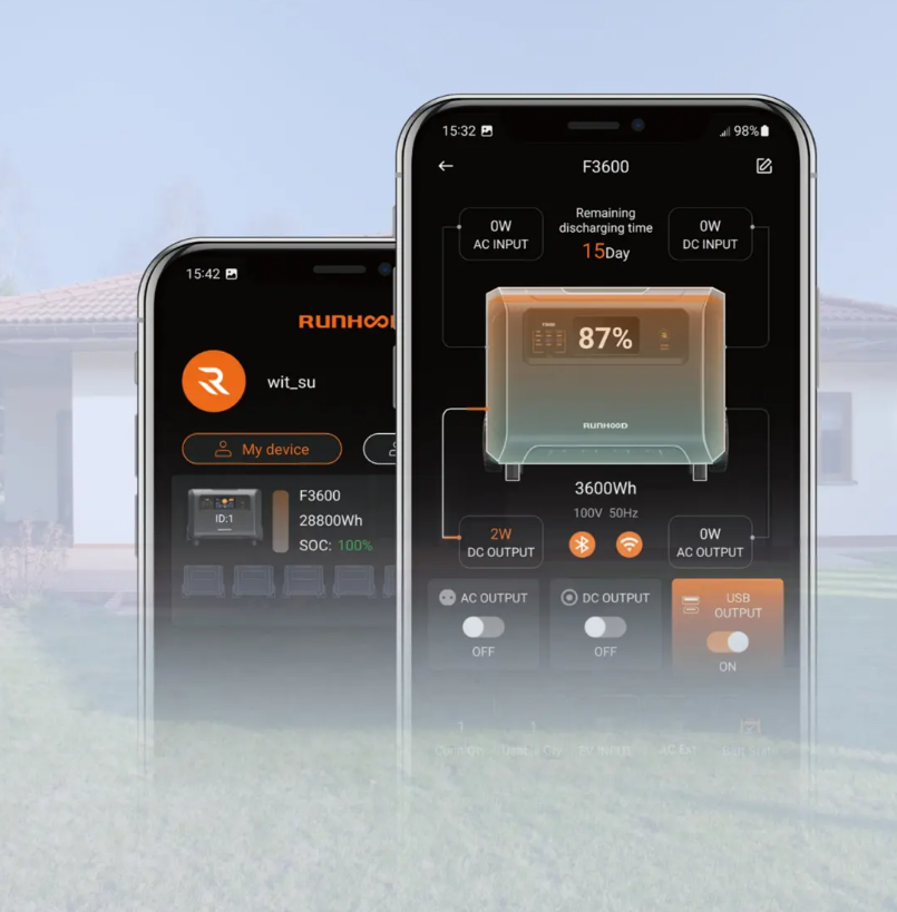 Das modulare System von Runhood deckt den Energiebedarf eines Haushalts, von 3,6 kWh bis 28,8 kWh, flexibel ab. Es kann gleichzeitig als Energiespeichersystem für Zuhause und als mobile Energiequelle dienen. Trennen Sie einfach das Hauptgerät und nutzen Sie 3600 Wh tragbare Energie. Die Zusatzbatterien können einfach mit dem Hybrid-Wechselrichter verbunden bleiben und funktionieren weiterhin als Heimspeichersystem.