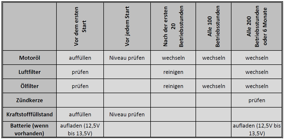 Hier finden Sie eine Übersicht über die Wartungsintervalle eines Benzin-Stromerzeugers. Befolgen Sie diese Wartungsintervalle unbedingt für die Langlebigkeit des Stromerzeugers! Detaillierte Informationen über die genaue Durchführung der Wartung finden Sie in den mitgelieferten Betriebsanleitungen.