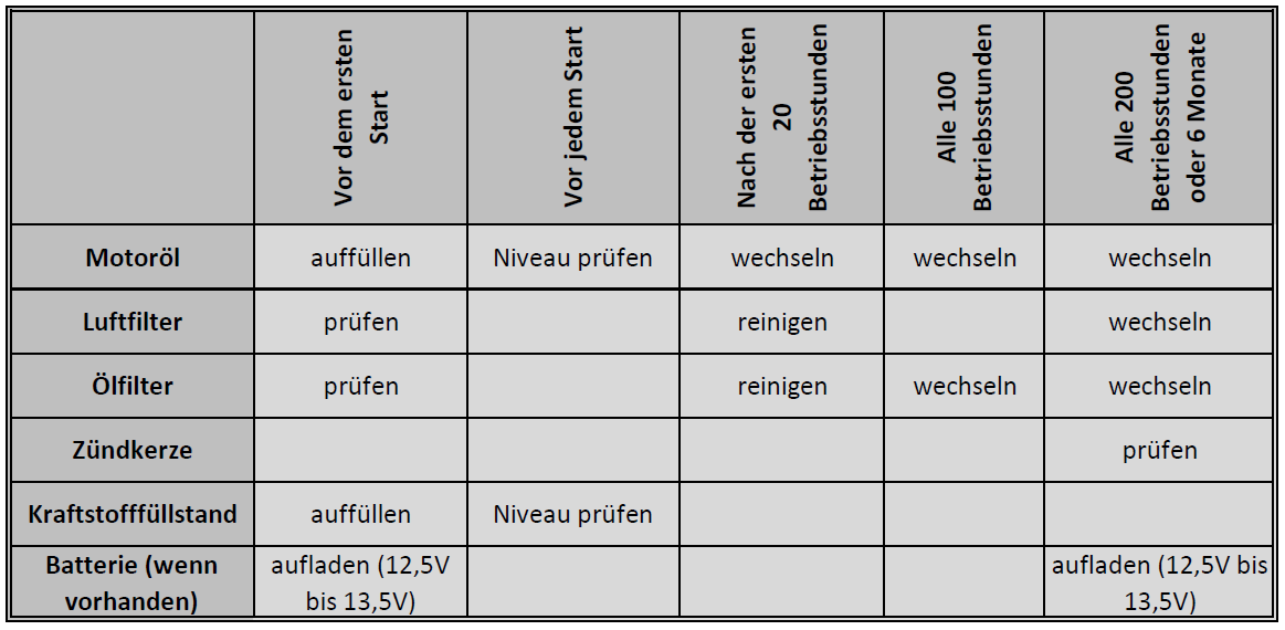 Alle 200 Betriebsstunden oder alle sechs Monate sollten Sie, wenn vorhanden, die Batterie aufladen. Zudem muss das Motoröl gewechselt werden und der Luft- und Ölfilter muss gereinigt werden.