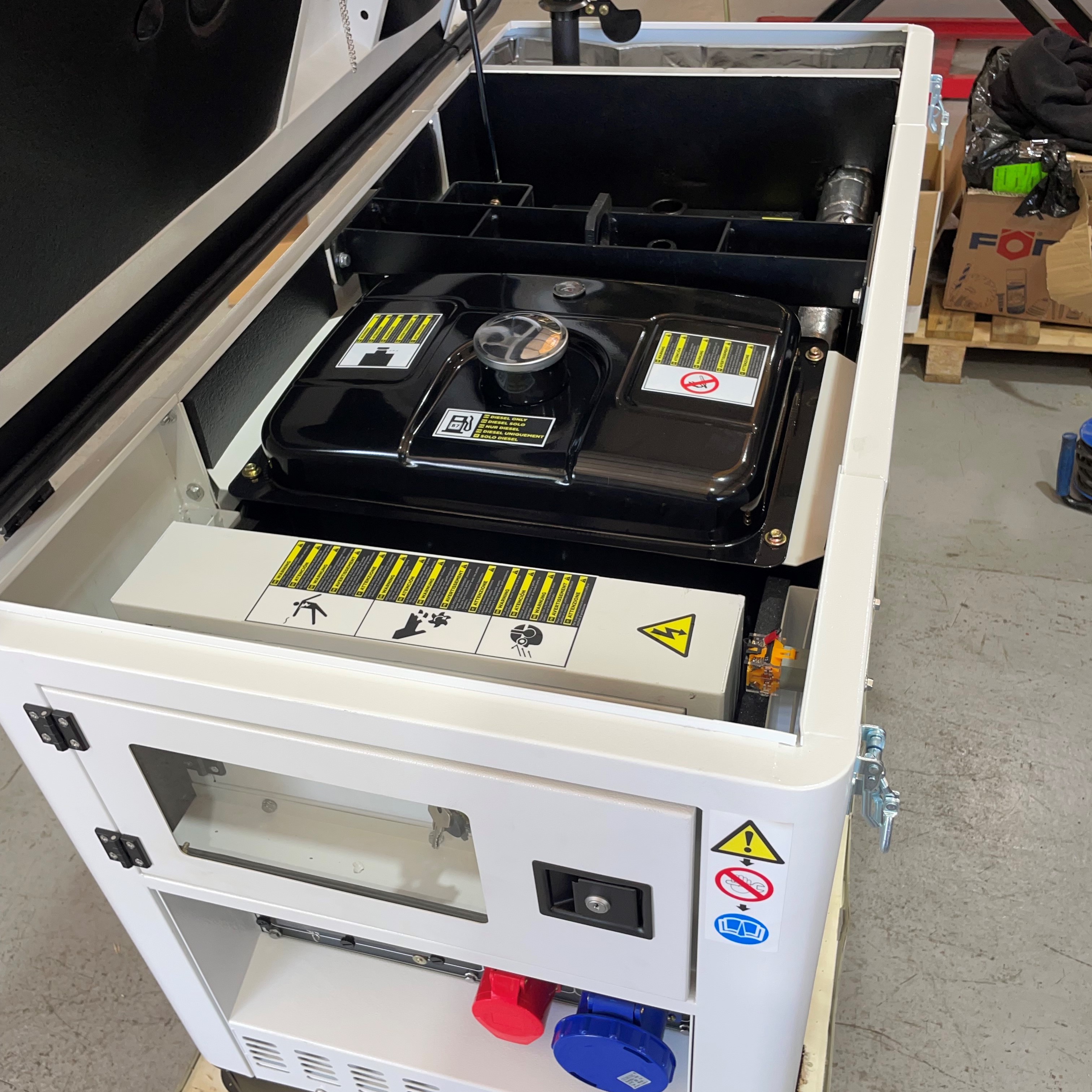 Die 63 A Steckdose ermöglicht Ihnen, die komplette Leistung über eine Steckdose zu ziehen. Somit ist dieses Aggregat gut für größere Stromabnehmer oder die Hausabsicherung geeignet. Darüber hinaus wird das Gerät vor der Auslieferung von Technikern in Betrieb genommen und geprüft. Dazu zählt, dass es mit Betriebsstoffen befüllt, eingestellt und unter Last getestet wird. Dieser Service hat einen Gegenwert von 499€ und ist, wie auch die Lieferkosten, im Preis enthalten. Somit müssen Sie nach der Lieferung lediglich den Kraftstofftank befüllen und können danach direkt mit der Stromerzeugung beginnen.